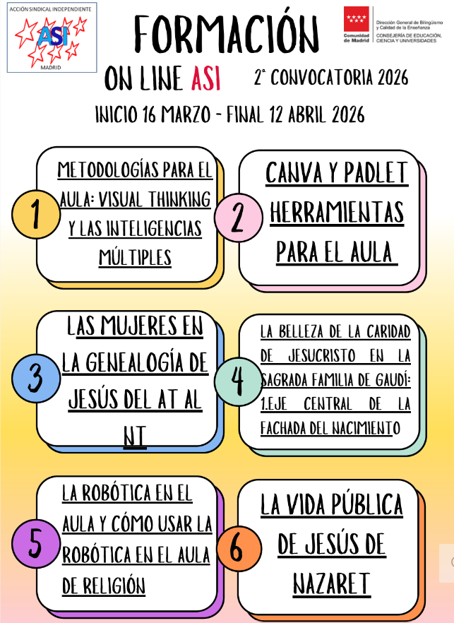 Ya puedes inscribirte en la segunda edición de 2025 de nuestros cursos de formación. Te recuerdo que son válidos a todos los efectos (SEXENIOS, CONCURSO DE TRASLADOS,,OPOSITORES PRESENTES EN LAS LISTAS DE INTERINIDAD, ADJUDICACIÓN DE VACANTES PROFESORES DE RELIGIÓN).